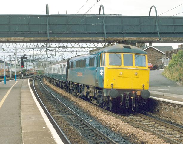 08/08/84:- A Class 86 electric locomotive runs a London bound express through Motherwell station.