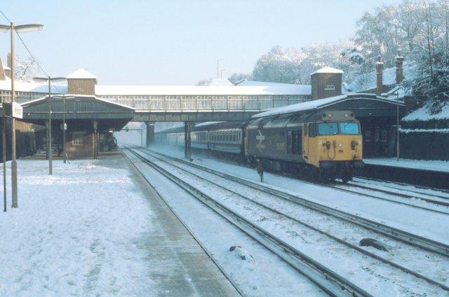 12/12/81:- 50045 "Achilles" sends the snow flying at Weybridge on a Waterloo - Exeter St. Davids service.