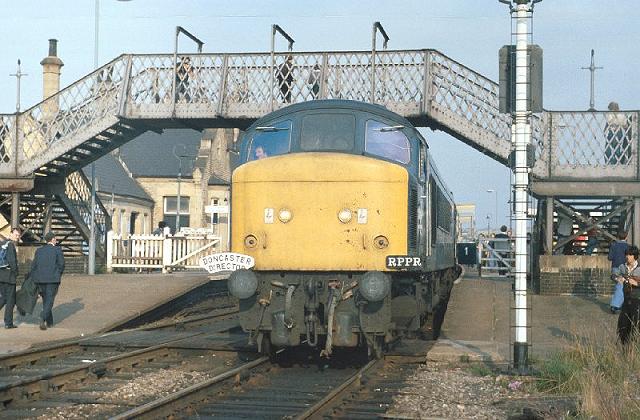19/08/79:- 45039 "The Manchester Regiment" stands under the footbridge at Mexborough Station at the photostop on the return Doncaster Director Railtour.