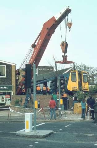 21/04/82:- 6 p.m. and rerailing work continues at Shepperton using the Wimbledon 75 ton breakdown crane.
