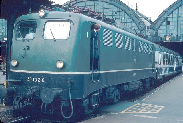 27/07/82:- DB Class 140 Bo-Bo Electric locomotive waits to leave Karlsruhe station.