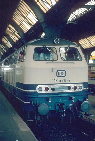 27/07/82:- DB Class 218 Electric locomotive stands at the platform inside Karlsruhe station.