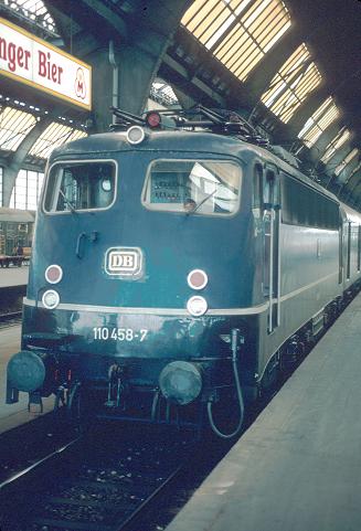 27/07/82:- DB Class 110 Bo-Bo Electric locomotive inside Karlsruhe station.