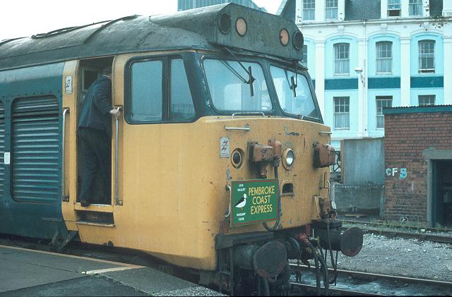 07/05/83:- Portrait of 50032 "Courageous" carrying the Pembroke Coast Express headboard at Cardiff Central shortly before departure.