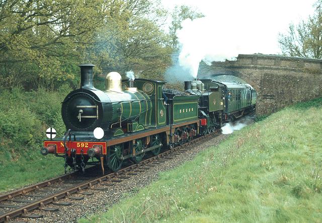 08/05/83:- C Class No. 592 leads USA tank No. 30064 under the bridge near Freshfield with a Horsted Keynes train.