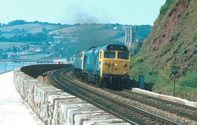 04/07/83:- 50019 "Ramillies" pilots a Class 47 on an eastbound train as it takes the curve out of Teignmouth station onto the sea wall.