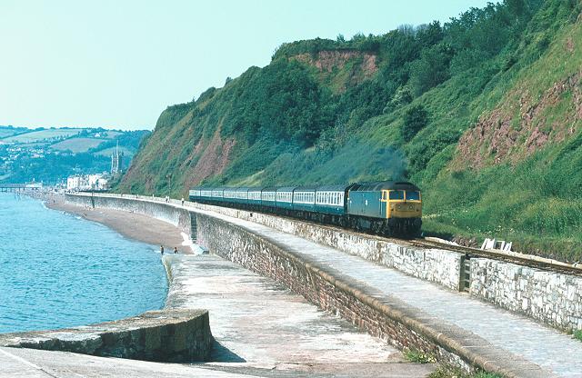 04/07/83:- 47113 viewed from the outcrop of rock near Teignmouth heads a Mk1 express towards Dawlish.