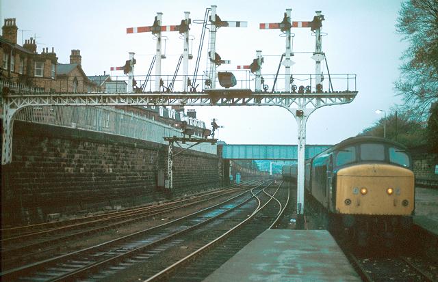 12/11/83:- The Class 45 backs the stock of the Scarborough Deviation Railtour out of Scarborough station under the semaphore gantry.