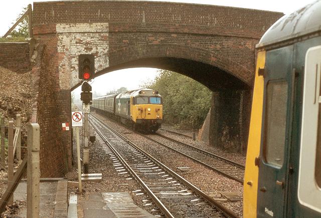 26/05/84:- 50009 "Conqueror" on a London bound express passes a DMU standing at Great Bedwyn station.