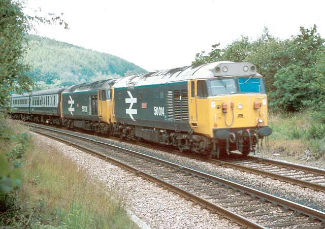 02/07/84:- 50014 and 50028 thunder eastwards near Liskeard.