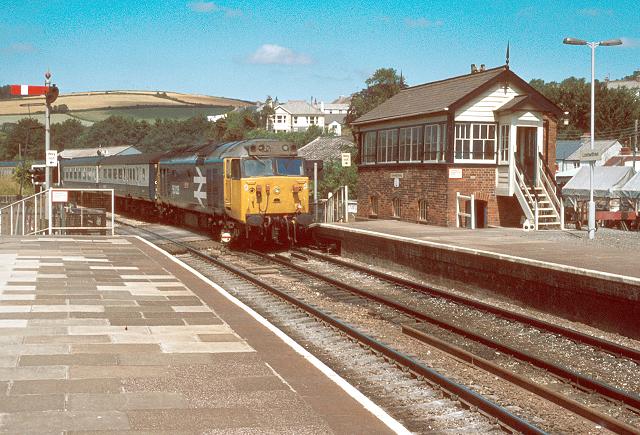 02/07/84:- 50025 "Invincible" heads a westbound train past Lostwithiel Signal Box and into the station.