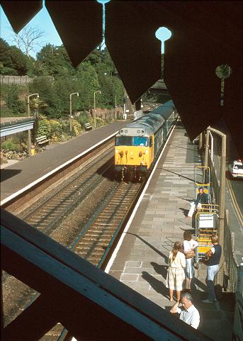 02/07/84:- 50047 "Swiftsure" seen from the footbridge arriving at St. Austell from London.