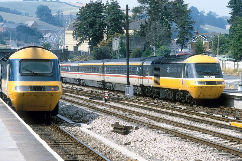 08/07/1984:- Executive liveried HST set, No. 253028 enters Totnes Up platform whilst another HST awaits departure from the Down platform.