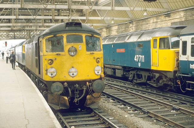 06/08/84:- A Class 26,47 combination on a Glasgow bound train stand alongside 47711 on an Edinburgh push-pull service at Perth station.