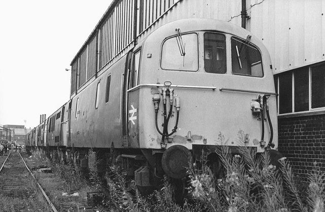 19/08/79:- Supposedly at Derby Research Centre, 74010 awaits it's fate with a line of withdrawn Class 71's at Doncaster Works.photograph by Mike Wainwright.