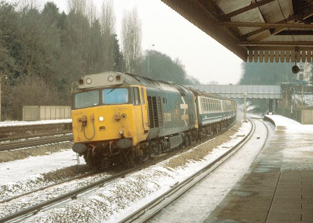 13/02/85:-50002 "Superb" leans to the curve as it speeds the 13.10 Waterloo - Exeter St. David's service through a snowy Farnborough station.