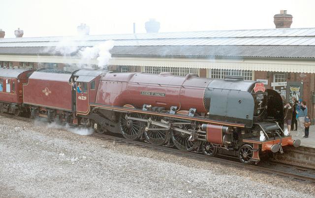 12/05/85:- Portrait of 46229 "Duchess of Hamilton" as she arrives at Bicester station with the Shakespeare Limited.