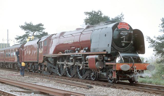 12/05/85:- 46229 stands at Bicester Station taking water on the Shakespeare Limited.