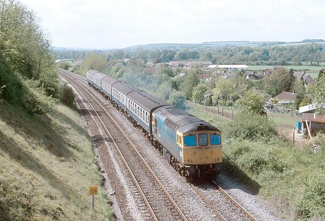 24/05/85:- 33039 on a Portsmouth bound train at Hanging Langford.