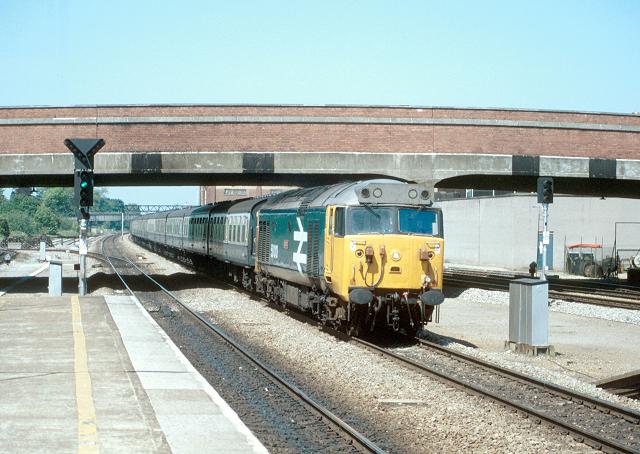 01/06/85:- 50013 "Agincourt" speeds through Slough station on the Up Fast.