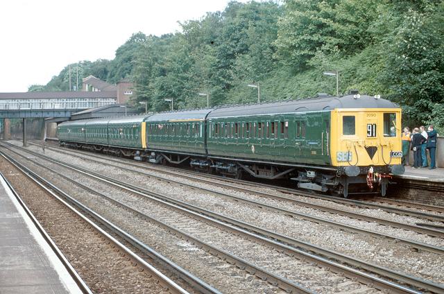 29/06/85:- The William and Mary railtour stands in the Down platform at Weybridge station.