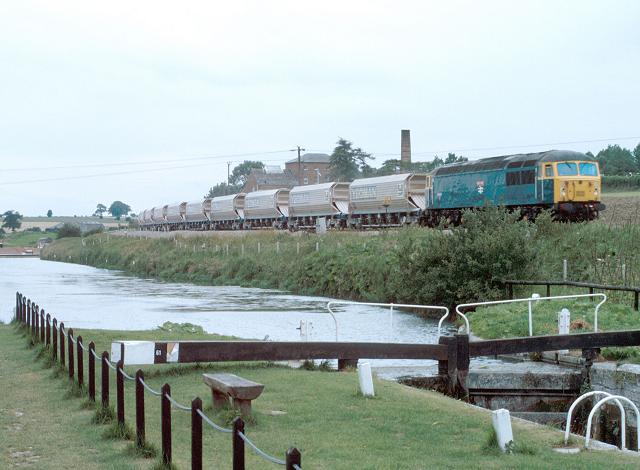 11/07/85:- 56031 "Merehead" heads 25 loaded Yeoman wagons eastwards past Crofton Lock.