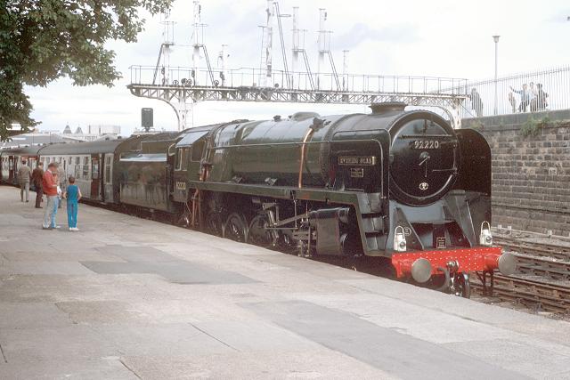 22/08/85:- 92220 stands under the disused signal gantry at Scarborough ready to leave with the return Scarborough Spa Express.