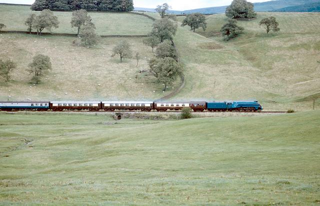 23/08/85:- LNER A4 4498 "Sir Nigel Gresley" heads the Cumbrian Mountain Pullman towards Hellifield near Settle.