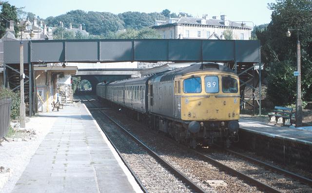 12/09/85:- 33039 heads a Portsmouth - Cardiff into Bradford-upon-Avon station.