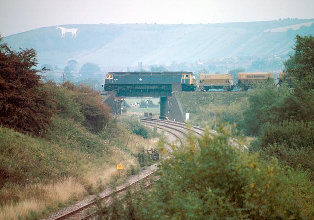 12/09/85:- 47150 crosses over the Westbury direct line with stone empties for Westbury Yard.