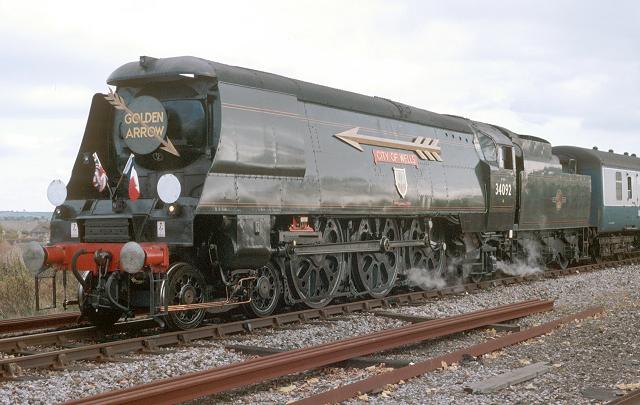 02/11/85:- Front 3/4 view of 34092 at Bicester on the William Shakespeare Express.