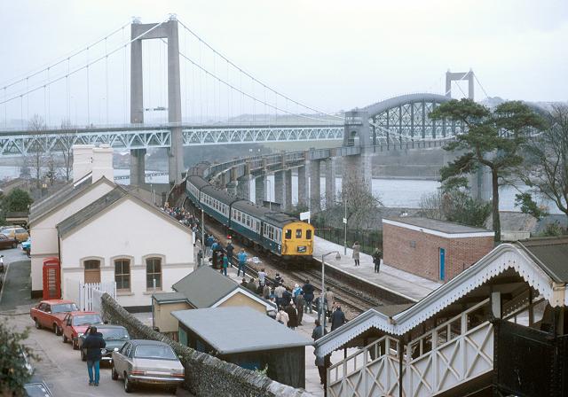 21/12/85:- 1032 shunts back onto the Tamar bridge during a photo-stop at Saltash station.