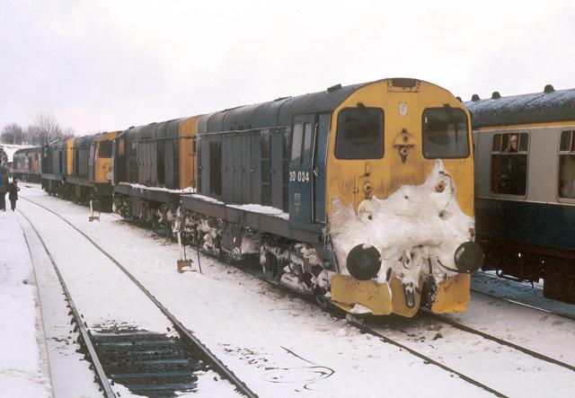 08/02/86:- Snow-encrusted 20034 and three other Class 20 locomotives in the centre road at Buxton station.