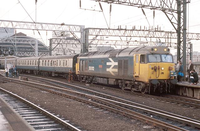08/02/86:- 50012 waits to leave Manchester Piccadilly station with the return Derbyshire Dingle railtour.
