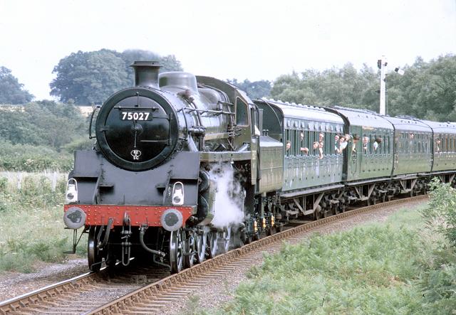 27/07/1986:- 75027 accelerates away from Sheffield Park at 15:55 with the Maunsell rake.