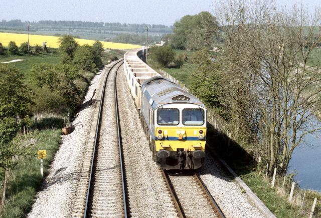 07/05/1987:- 59004 heads 59 empty Yeoman wagons west alongside the canal at Little Bedwyn.