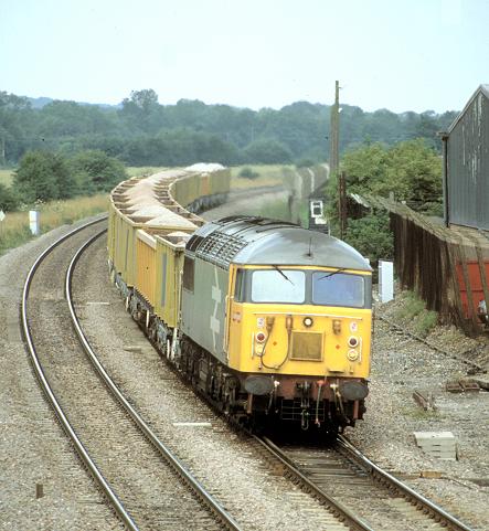 01/07/1988:- An unidentified Class 56 locomotive on a loaded stone train approaches Thatcham from the west.