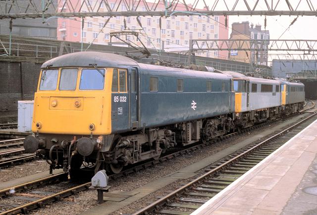 29/03/89:- 85032 and two other electric locomotives stand on the spare road at Euston station.