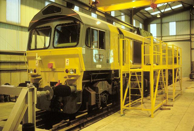 06/12/90:- 59102 inside the maintenance sheds at Whatley Quarry.