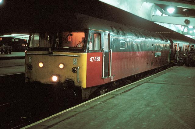 08/04/91:- 47458 "County of Cambridgeshire" stands in the platforms at Derby station on an evening mail train.