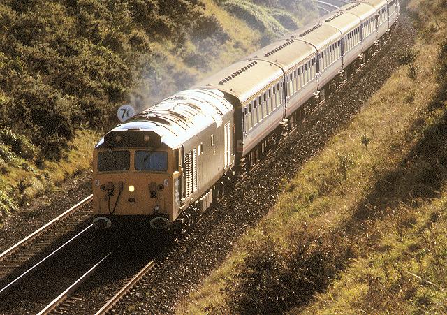 05/10/91:- D400 "Fearless" reflects the rays of the afternoon sun as it runs through Milborne Port with the 15.03 Exeter - Waterloo service.