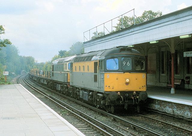 23/10/92:- 33201 and D6508 head a northbound rail train through Acton Central station.