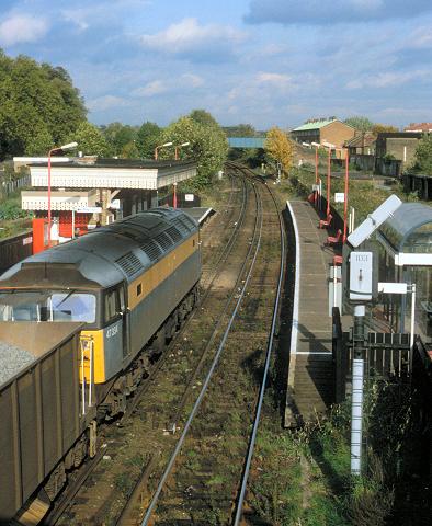 23/10/92:- 47334 stops briefly at South Acton station to pick up staff.