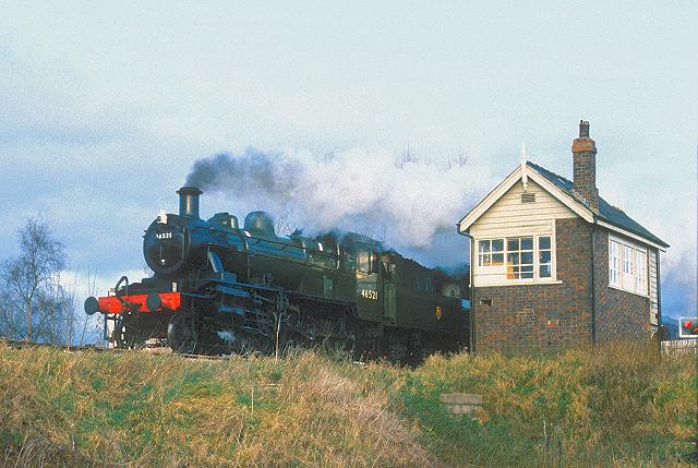 12/12/92:- LMS Class 2MT No. 46521 passes Ascott-underWychwood Signal Box at 14.30 with it's excursion train from Didcot to Kidderminster.