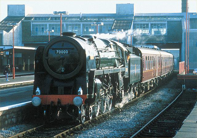 20/12/92:- 70000 "Britannia" arrives at Banbury, 25 minutes late at 12.57 with the William Shakespeare Express for Stratford-upon-Avon.
