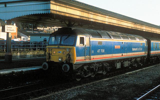 08/01//93:- 47708 ticking over at platform 2, Exeter St. Davids, having arrived from Waterloo at 15.23.