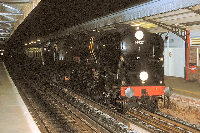 10/04/93:- SR West Country Pacific No. 34027 "Taw Valley" arrives at Basigstoke at 20.50 with the return South Western Limited railtour from Yeovil to Waterloo.