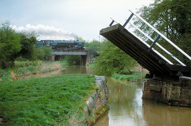 11/04/93:- No. 70000 "Britannia" heads the outbound William Shakespeare Express over the Oxford canal at Shipton-on-Cherwell.