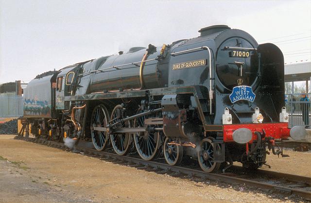 17/04/93:- BR Class 8 4-6-2 No. 71000 "Duke of Gloucester" with "The West Anglian" headboard stands in the sidings at Ely.