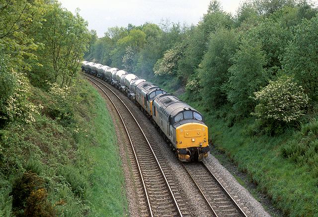 18/05/93:- 37412 and 37671 double-head the northbound Burngullow - Irvine (via Alexandra Dock Junction) tanker train at Goytre at 16.50.